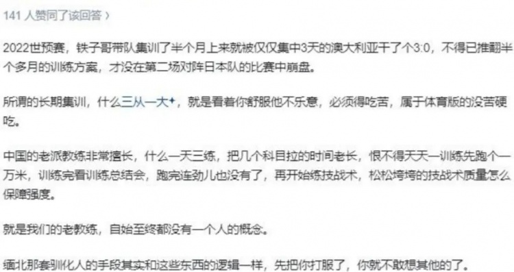 所以,问题不在集训本身,而在于现在大环境改变下传统意义上长期集训表现出的不适应性。集训本身在这一过程中有什么错呢?而且宫鲁鸣的话“只有长期集训才能提升默契贯彻战术。”这一“只有...才...”的句式起码是基于过去的实践经验得出的结论;而在这一问题下的讨论里,我们能看到大量“只要…就…”般的许愿。