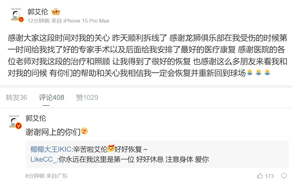 2025-03-05 23:53:41郭艾伦更博报平安:顺利拆线了 我一定会恢复并回到球场!
