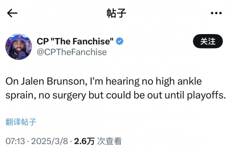 2025-03-08 12:04:33尼克斯博主:我听说布伦森无需接受手术 但可能要缺席至季后赛前