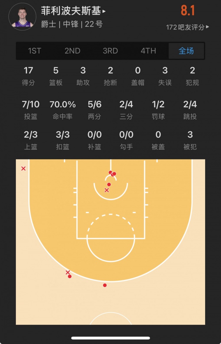 爵士32号秀 凯尔-菲利波夫斯基 登场27.3分钟