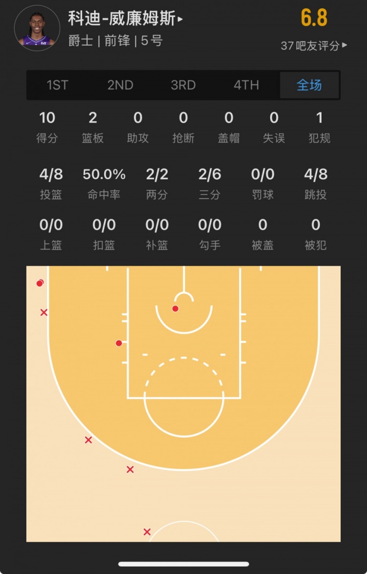 爵士10号秀 科迪-威廉姆斯 登场21.6分钟