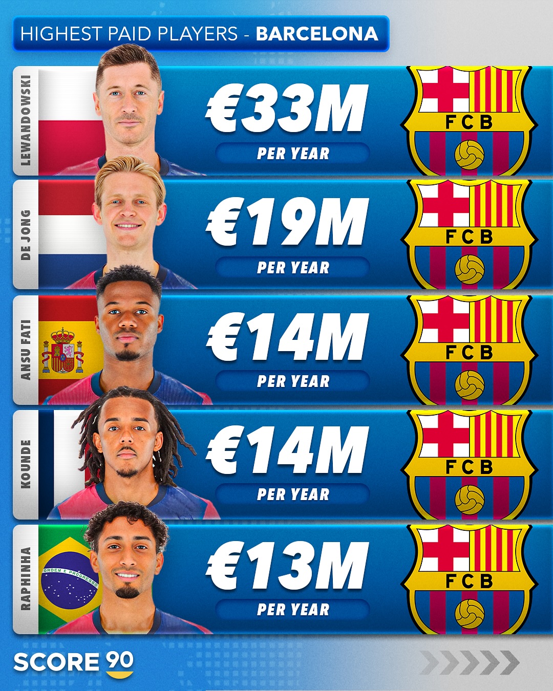 2025-03-11 23:49:56巴萨队内年薪前5:莱万3300万第1,德容1900万第2,法蒂1400万第3