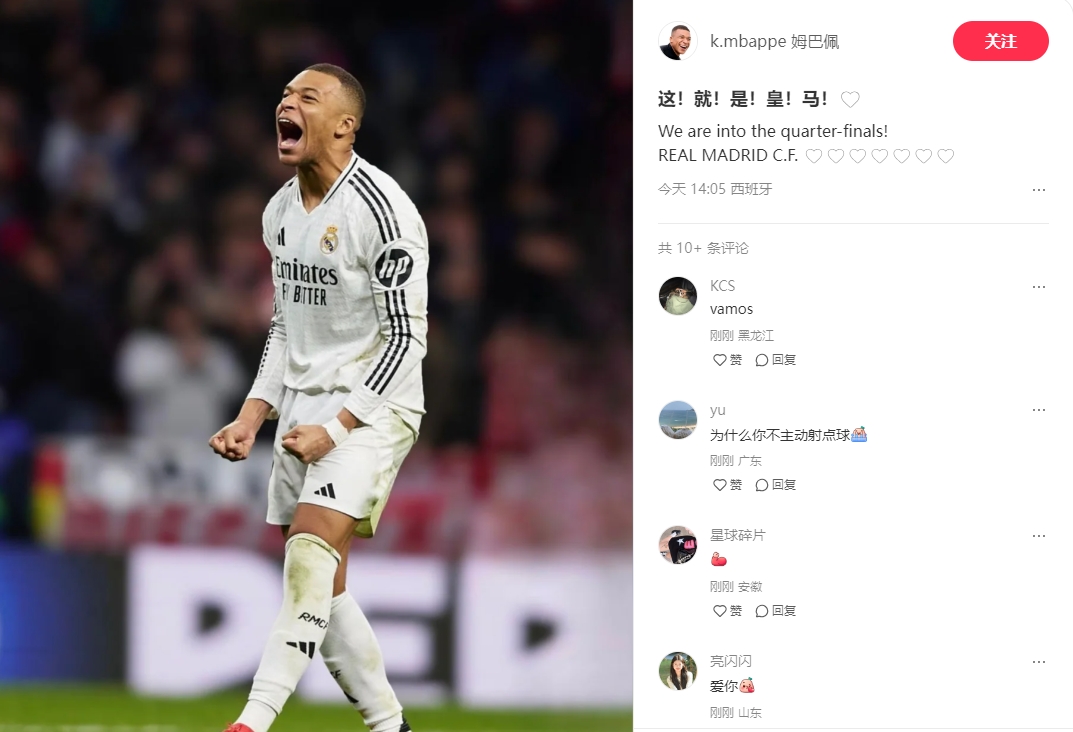 2025-03-13 14:29:14很兴奋!姆巴佩更新个人中文社媒:这!就!是!皇!马!