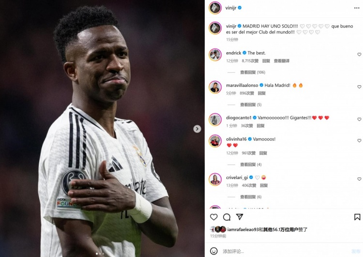 2025-03-13 14:39:56维尼修斯社媒发文:马德里只有唯一,作为世界最佳球队一员太棒了
