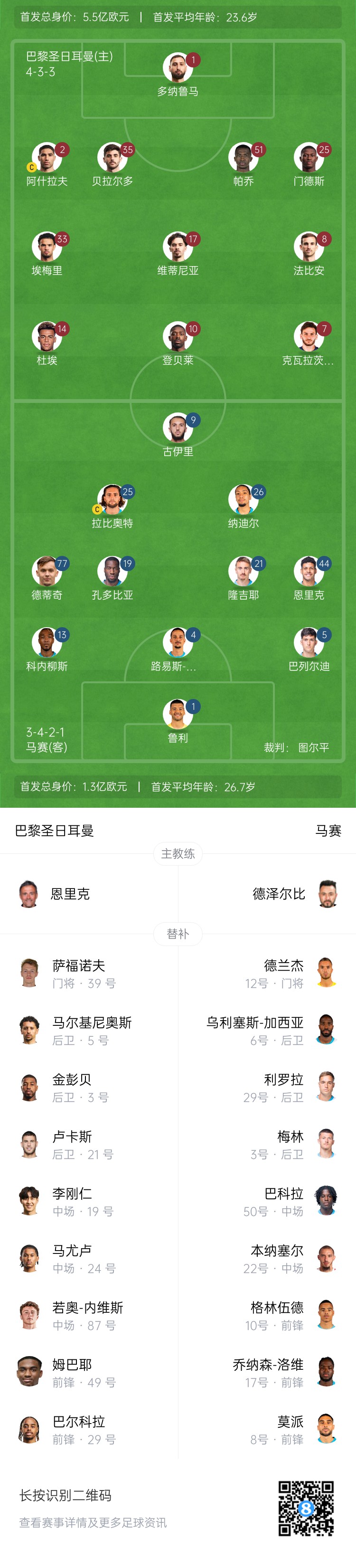 巴黎首发:1-多纳鲁马、2-阿什拉夫、35-贝拉尔多、51-帕乔、25-努诺-门德斯、8-法比安、17-维蒂尼亚、33-扎伊尔-埃梅里、7-克瓦拉茨赫利亚、10-登贝莱、14-杜埃