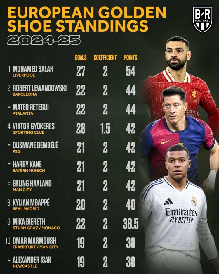 2025-03-18 21:14:24本赛季欧洲金靴排名:萨拉赫54分领跑,莱万、雷特吉44分次席