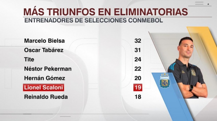 2025-03-22 10:09:07斯卡洛尼执教阿根廷世预赛取胜19场,南美国家队主帅第6多