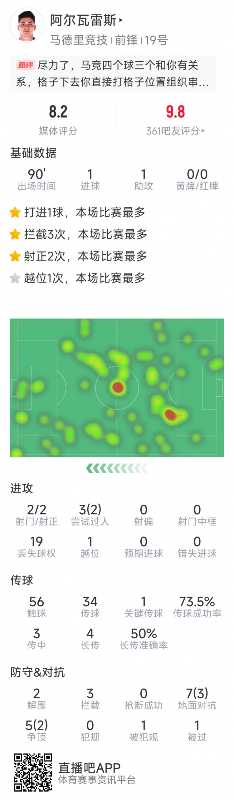 2025-02-26 08:09:11阿尔瓦雷斯本场数据:传射建功,2次射门均射正,3次拦截