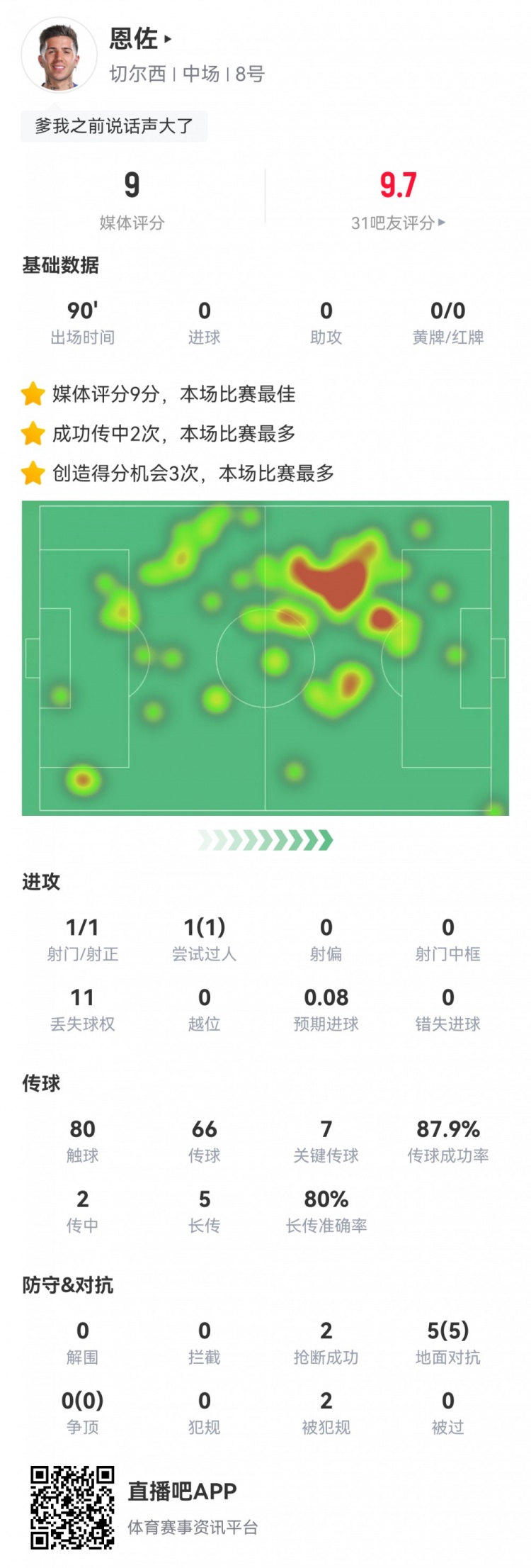 2025-02-26 08:09:55战神!恩佐数据:7次关键传球,5次对抗全成功,评分9.0全场最高
