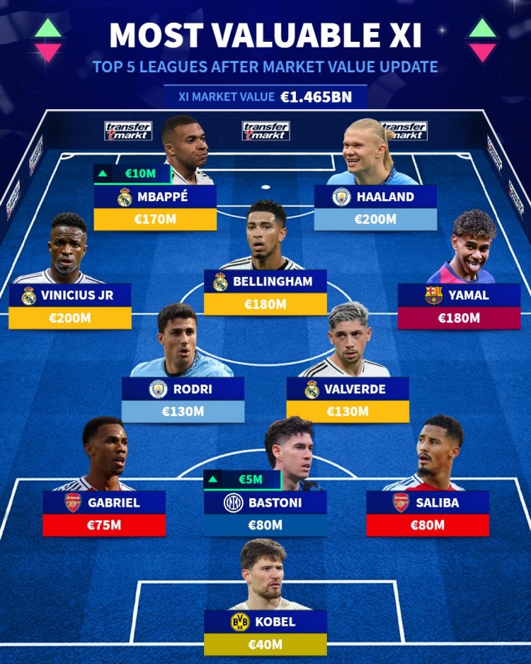 2025-03-31 10:16:06五大联赛身价最高阵:哈兰德、姆巴佩、亚马尔在列,总价超14亿欧