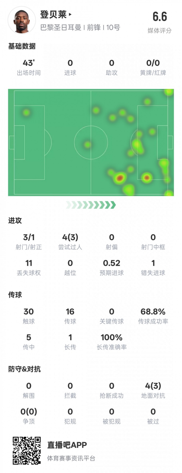 2025-03-06 10:43:49登贝莱半场数据:3过人成功11次丢失球权&错失1进球机会,评分6.6
