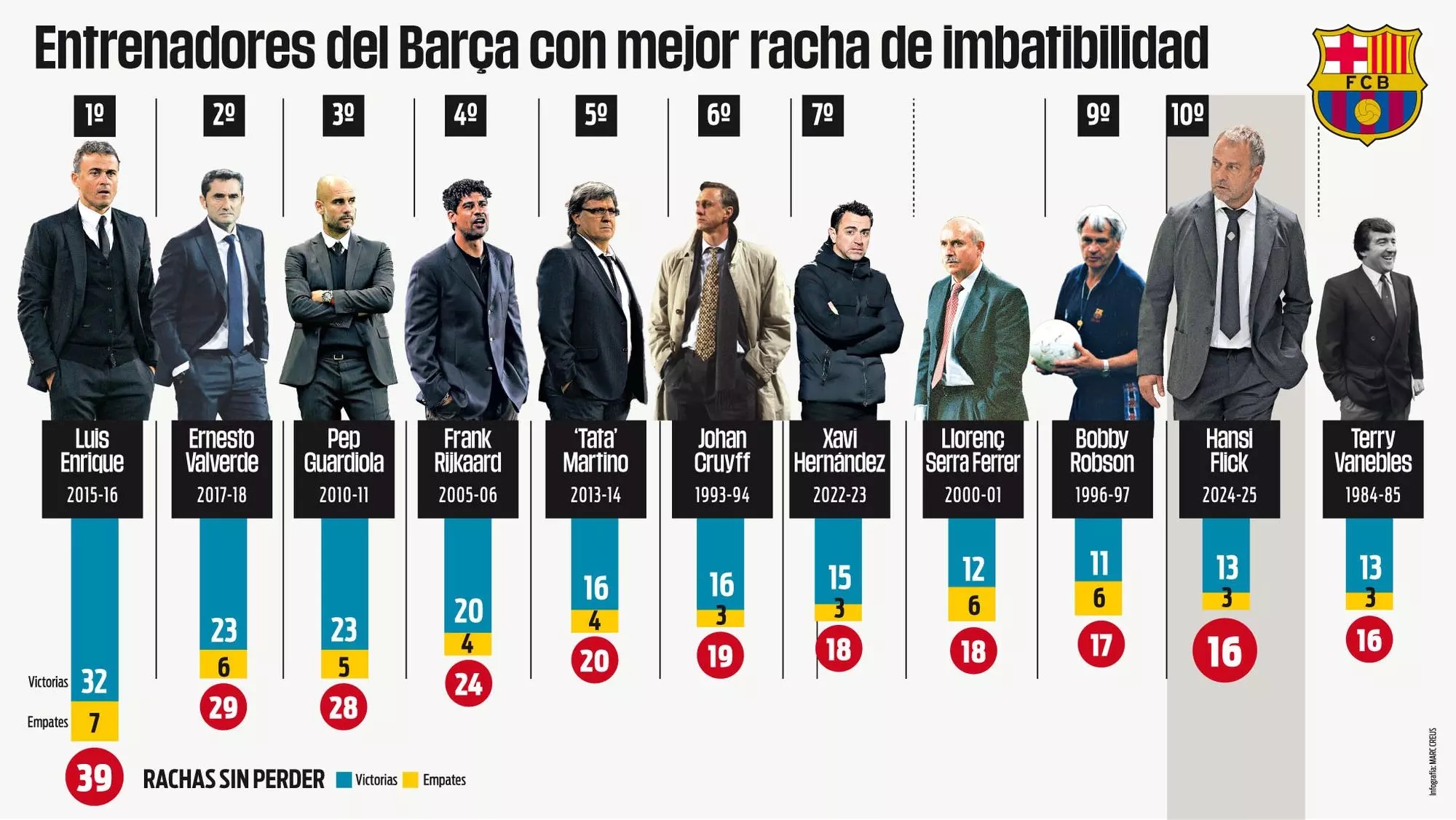 3月7日讯 根据《每日体育报》的报道,弗里克目前执教巴萨16场取得13胜3平的不败战绩,排名队史第10位。