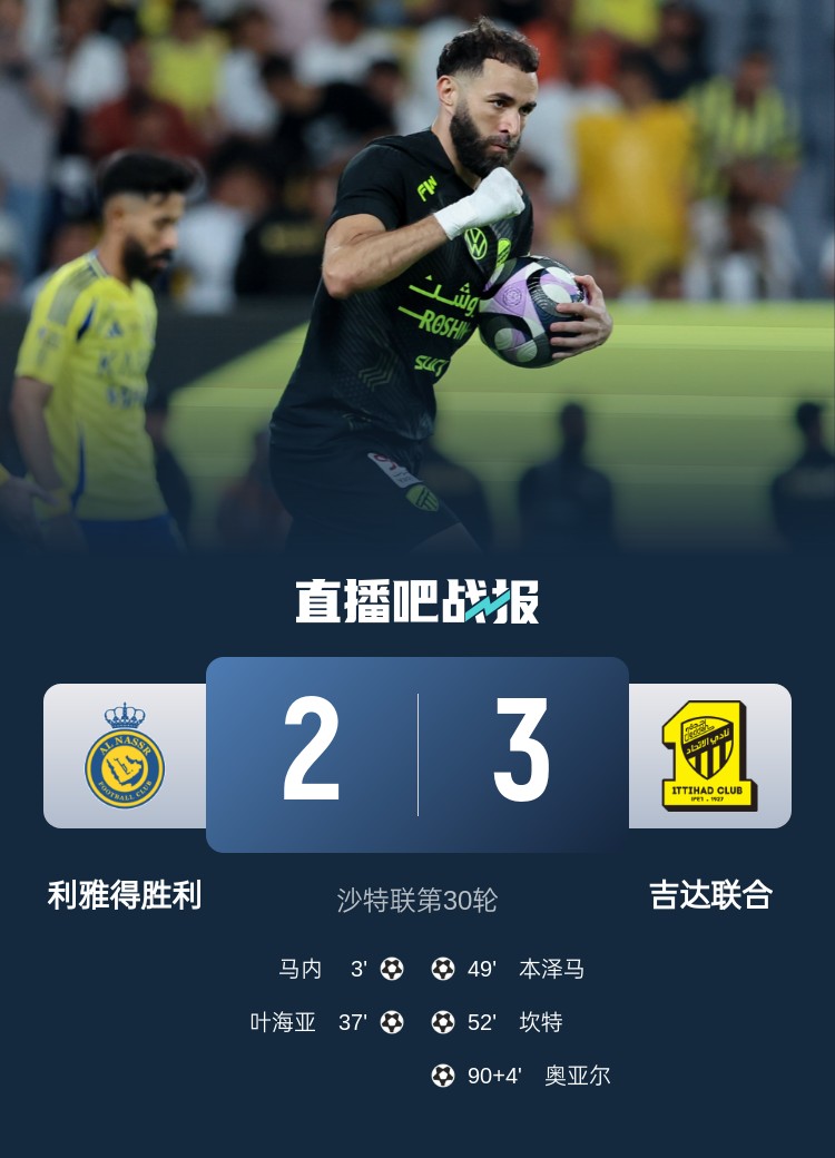 吉达联合本轮3-2逆转绝杀利雅得胜利!本泽马、坎特和奥亚尔均破门。