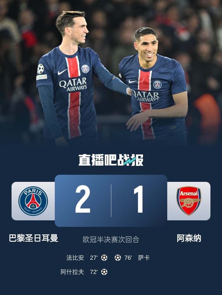 欧冠半决赛次回合,巴黎2-1总比分3-1淘汰阿森纳,队史第2次晋级欧冠决赛。