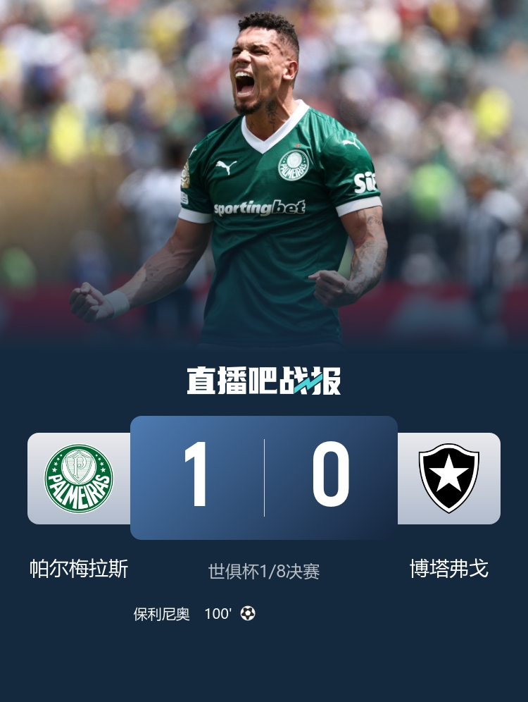 进8强!帕尔梅拉斯1-0博塔弗戈 两队全场12黄1红保利尼奥加时制胜