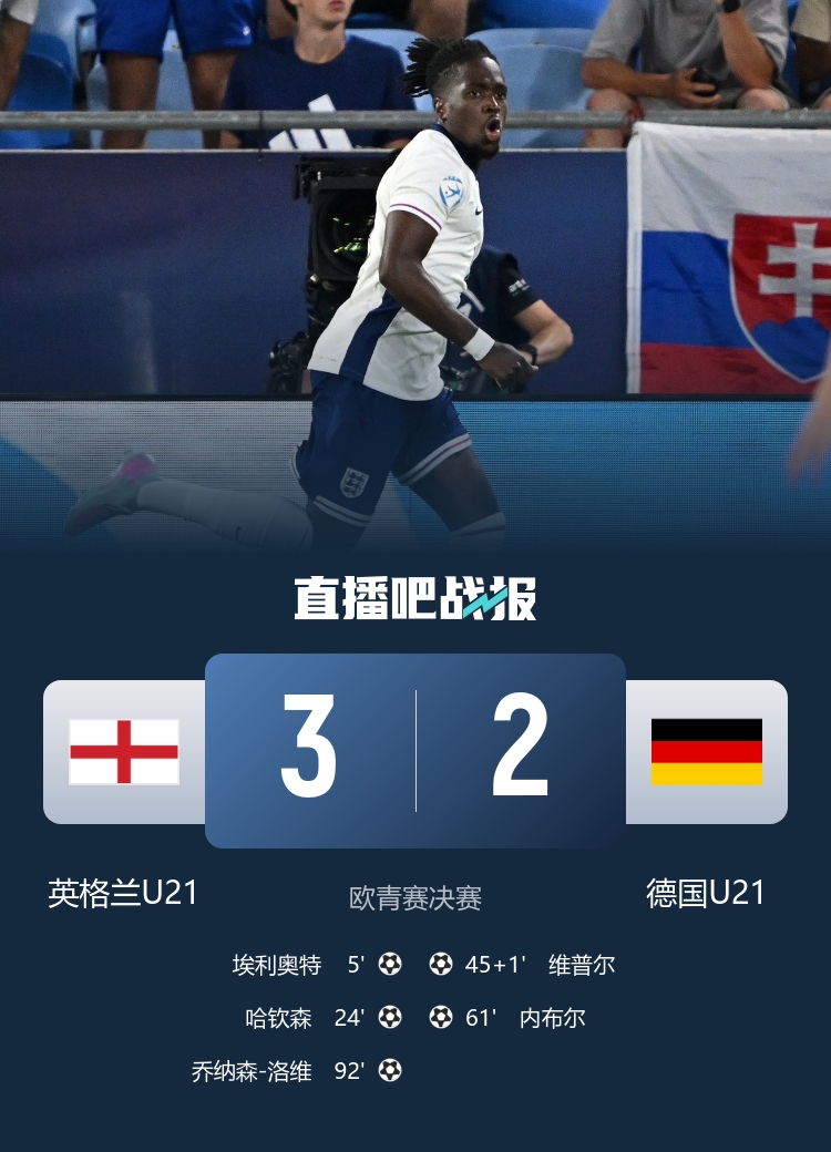 U21欧青赛决赛,英格兰U21历经120分钟鏖战,3-2战胜德国U21,成功卫冕欧青赛冠军,埃利奥特当选赛事最佳球员。